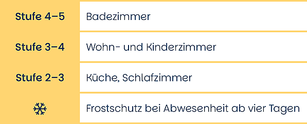 Ein angenehmes Raumklima schaffen Sie dann, wenn Sie in allen Räumen gleichmäßig schwach heizen. Wir empfehlen Ihnen folgende Tabelle zur Orientierung.
