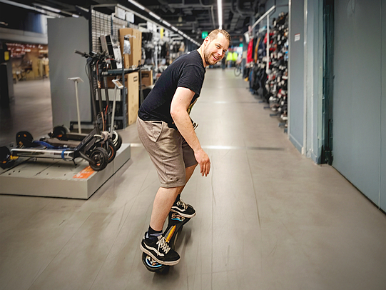 Mit dem „Lastenrad" zur Arbeit, weil … man das im Prenzl’berg nun mal so macht. Spaß, ich fahre mit den Öffis und habe aktuell kein Fahrrad. Dafür kann ich aber Waveboard fahren, dieses lustige „Skateboard“ mit zwei beweglichen Rollen (lacht).