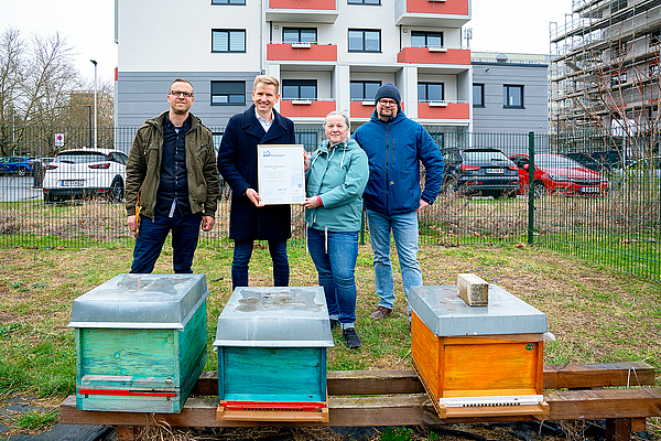 Bild 1: Eric Frey, TAG Wohnen Regionalleiter in Thüringen erhält die NAThüringen-Urkunde für den Standort Gera von Grit Booth, Leiterin der NAT-Geschäftsstelle -beide Bildmitte- überreicht. Mit dabei waren Imker Jens Grashof, links im Bild und Maik Gerstner, Vorsitzender der NaturFreunde Gera e.V. rechts im Bild, alle stehen gemeinsam hinter drei Bienenstöcken im Wohnquartier Gera-Lusan. © nathüringen
